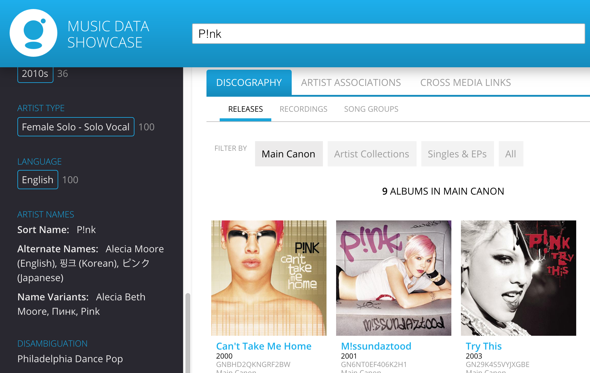 | Object Name | artistID, recordingID, ID (under releaseType array) |