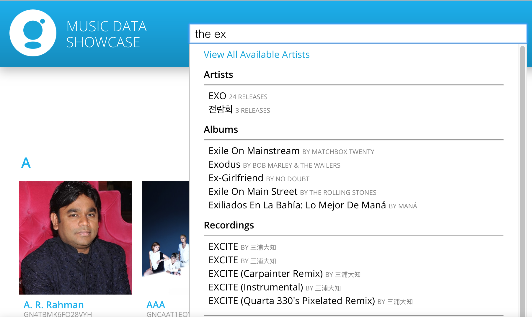 Band names with short names or words are often excluded (in the case for "the" above) or incorrectly identified as being part of a word ("ex" here is being associated with "EXO", "Exile", "Excite" etc.). If users are expected to be searching for such bands, then they will need to be able to search with exact match with the Artist Name or its variants.