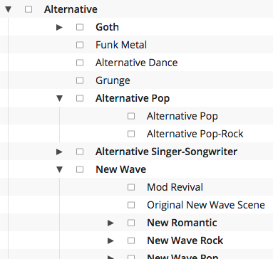- Find the genre name "Stage Musicals", or "Musical Film/TV Music" under nodeName in the Hierarchy file and retrieve its respective nodeID and mappedDescriptorIDs .