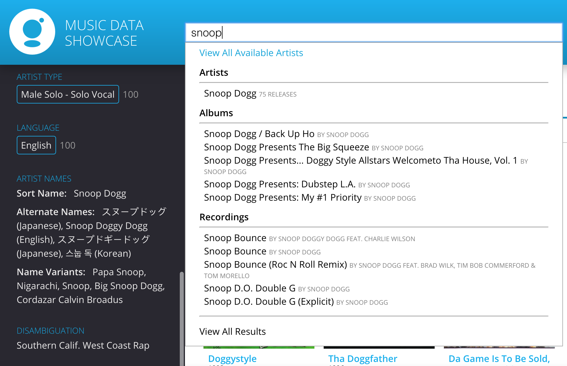 - Each Alternate Name and Name Variant rolls up to the same Artist ID. Display the artist name as the search result. For example, when users type in "Snoop" (as above), the Artist result shows the ArtistName, and does not show Snoop, Snoop Dogg, Snoop Doggy Dog as separate artists/results.