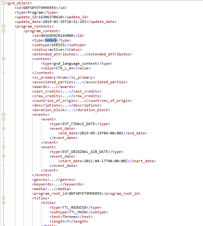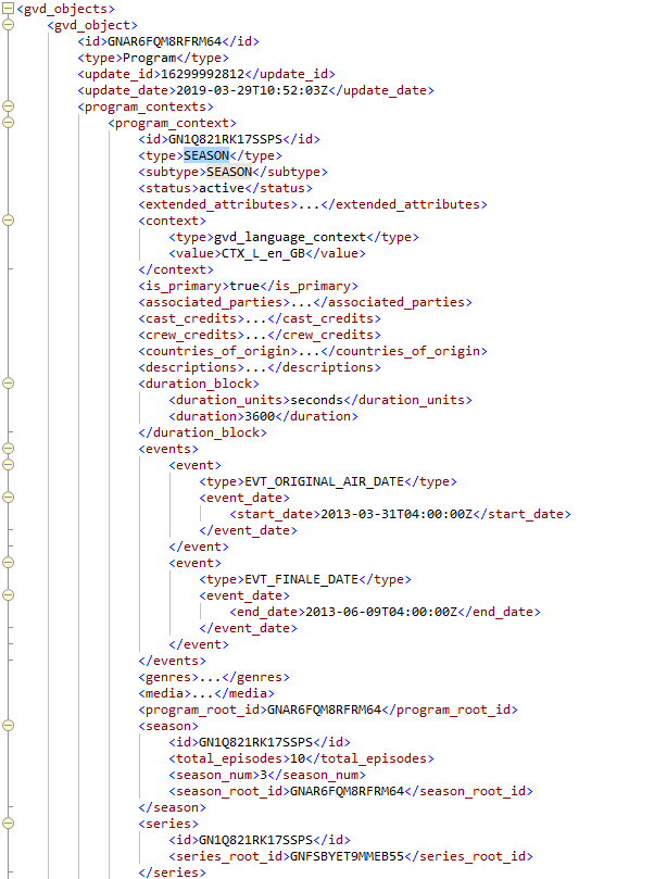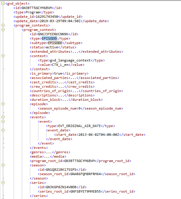 An Episode contains all the Program attributes such as titles, descriptions, genre, pointers to cast, crew, imagery, etc. Episodes also have references to Series and Season, which are available as individual program documents in GVD.