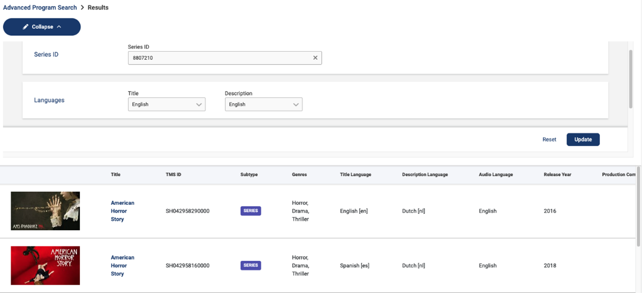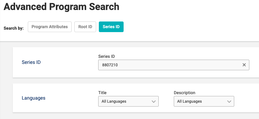 - Enter in the Series ID and any title and language combination to narrow down the search or keep empty for all TMS IDs under the Series ID. Using Series ID will help you get to all seasons of a super series, a series that changes title from season to season e.g., American Horror Story [Season 1 title: American Horror Story: Murder House, Season 2 title: American Horror Story: Asylum, etc.]