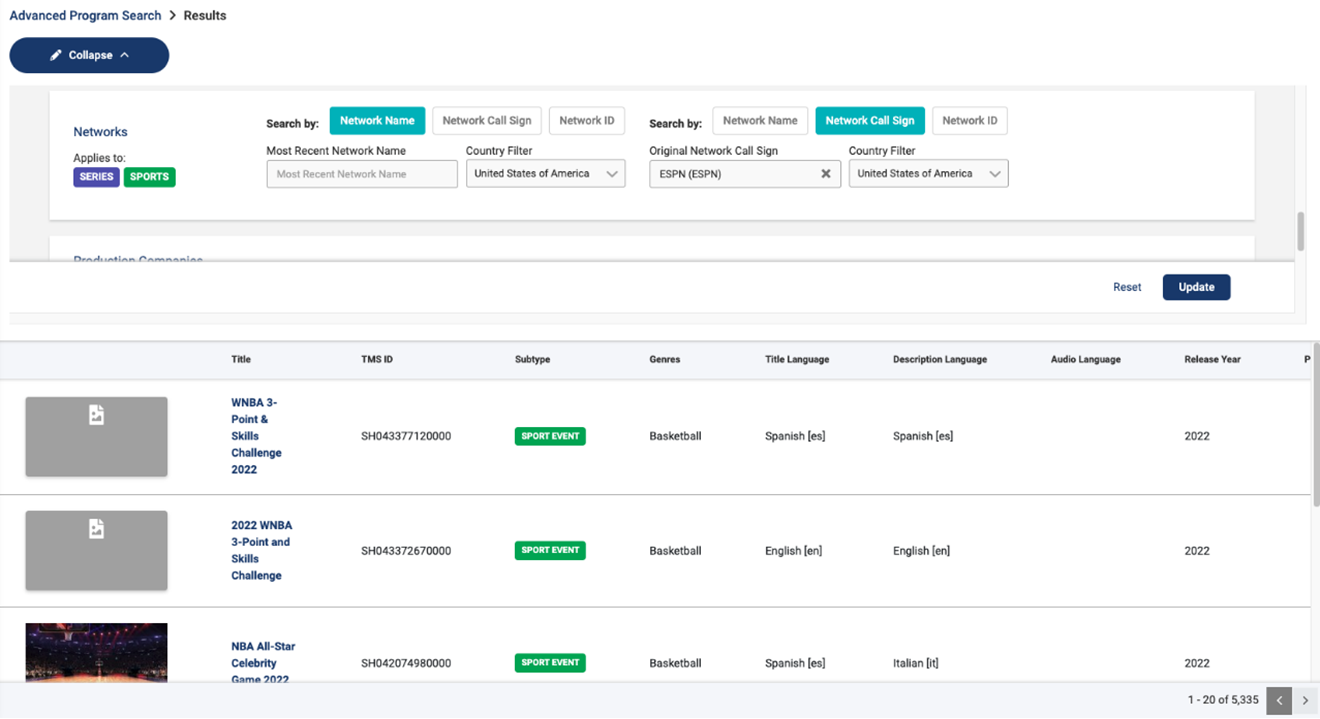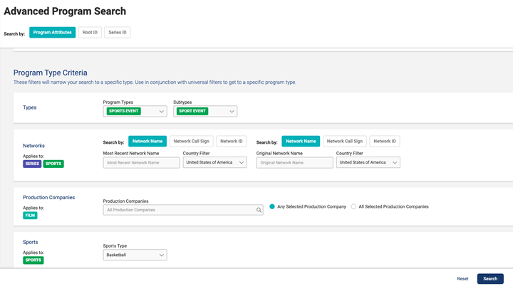 Search for programs by program metadata fields including title, genre, release year, program type, sport type, along with a Root ID and Series ID search. This module is helpful for hard-to-find content, grouping of content based on similar attributes, verifying international content, and id searches aside from TMS ID search.