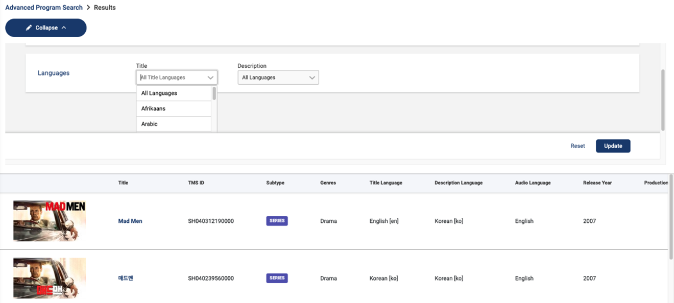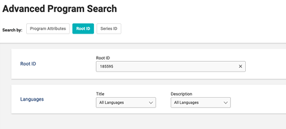 - Enter in the Root ID and any title and language combination to narrow down the search or keep empty for all TMS IDs under the Root ID.