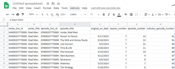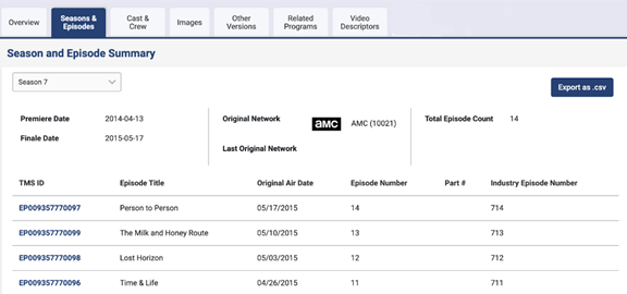 Click the Export as .csv button to download TMS IDs, Original Air Dates, and episode numbers.