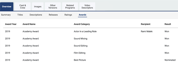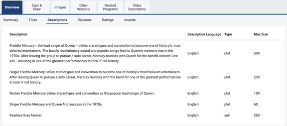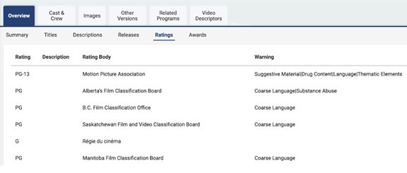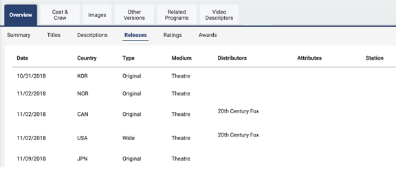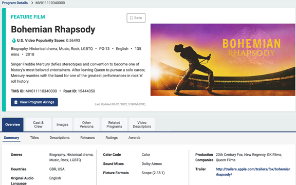 - The Summary tab displays core details including Genre, Production Countries, Original Audio Language, and Production Companies.