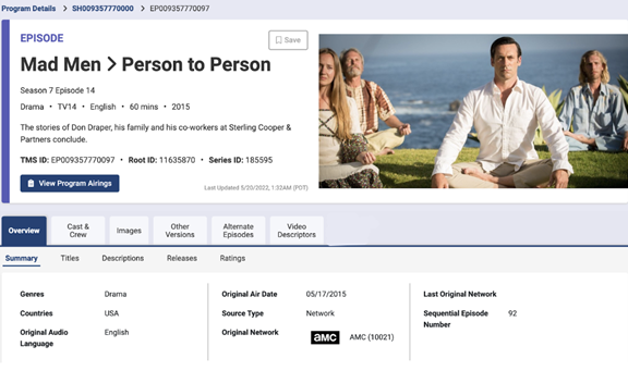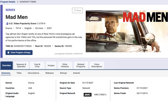 - The Summary tab displays core details including Genres, Production Countries, Original Air Date, Network, and Premiere and Finale date.