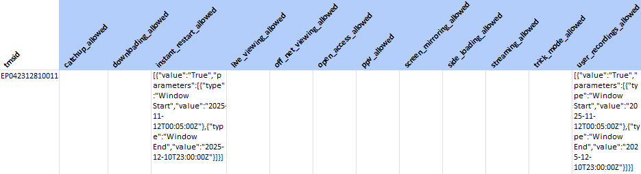 The Content Rights CSV file is a schedule report that includes Content Rights fields. Below is an example of an episode, showing Content Rights fields. Other schedule-related fields are hidden. In this example, instant_restart_allowed and user_recordings_allowed rights are shown.