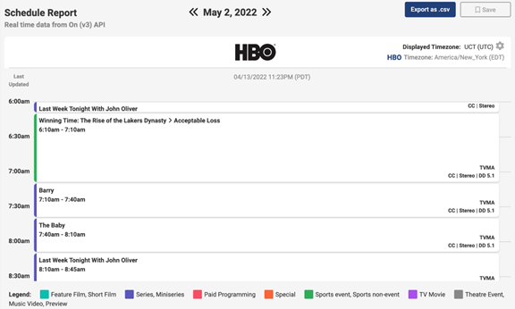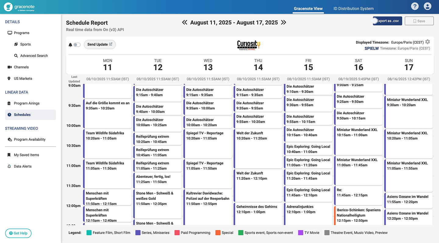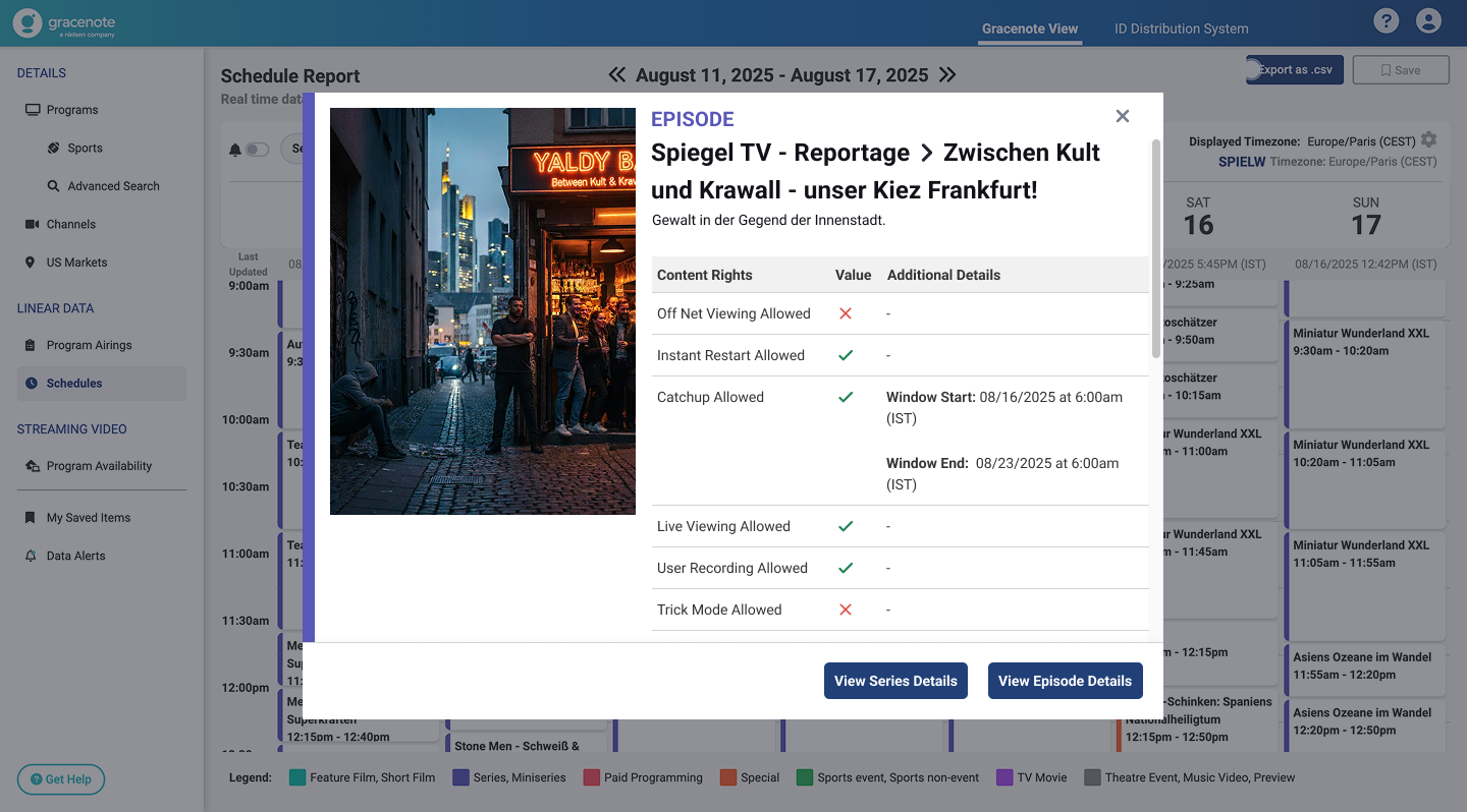 Using the Content Rights feature you can view and export detailed content availability data for Schedule Events.