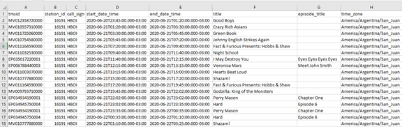 Open the downloaded CSV. The file will now include columns containing all available Content Rights data for each Schedule Event.
