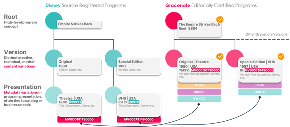 In the following hypothetical example, the source provider is Disney. Using GN IDS, the Disney media team created a new presentation of the original "The Empire Strikes Back" with an external ID of VWXYZ. Gracenote editorial staff linked this presentation to the TMS ID MV000191730000, the ID of the original 1980 USA theatrical version of this program. The example also shows the TMS ID mapping of the 1997 Special Edition for a new presentation with external ID QRSTU.
