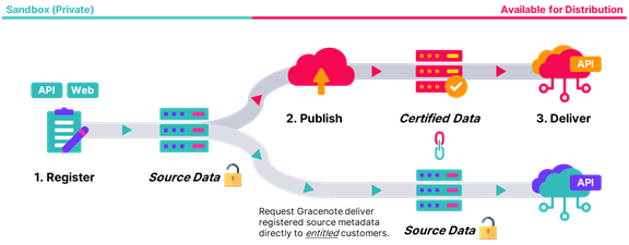- Source Data Delivery: Your metadata for published programs is made available using the Source Data Delivery process. This process uses a streamlined set of APIs related to Gracenote On API.