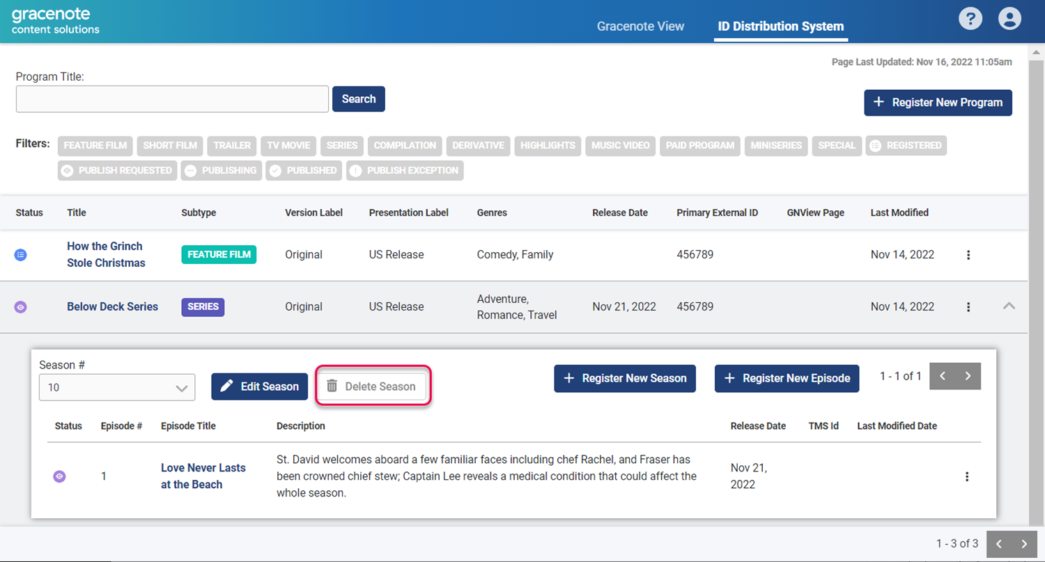 - Click the toggle row expand button to the far right of the series row. This opens the season panel.