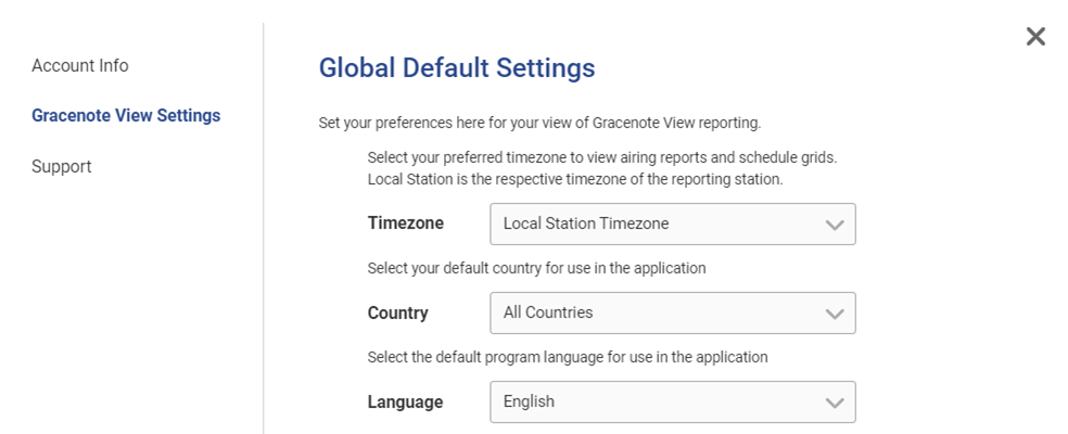 - Select Gracenote View Settings to view or set your time zone, country, and language.