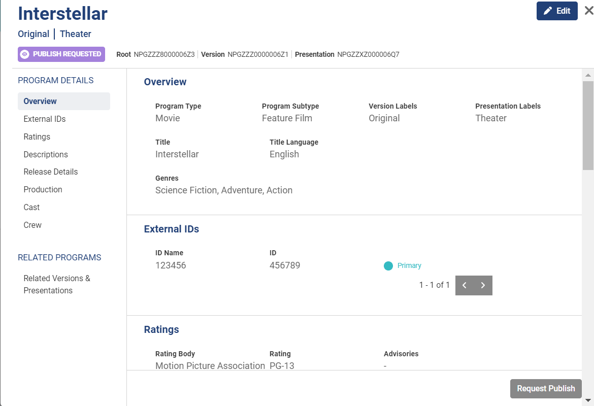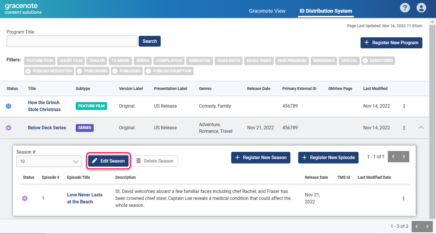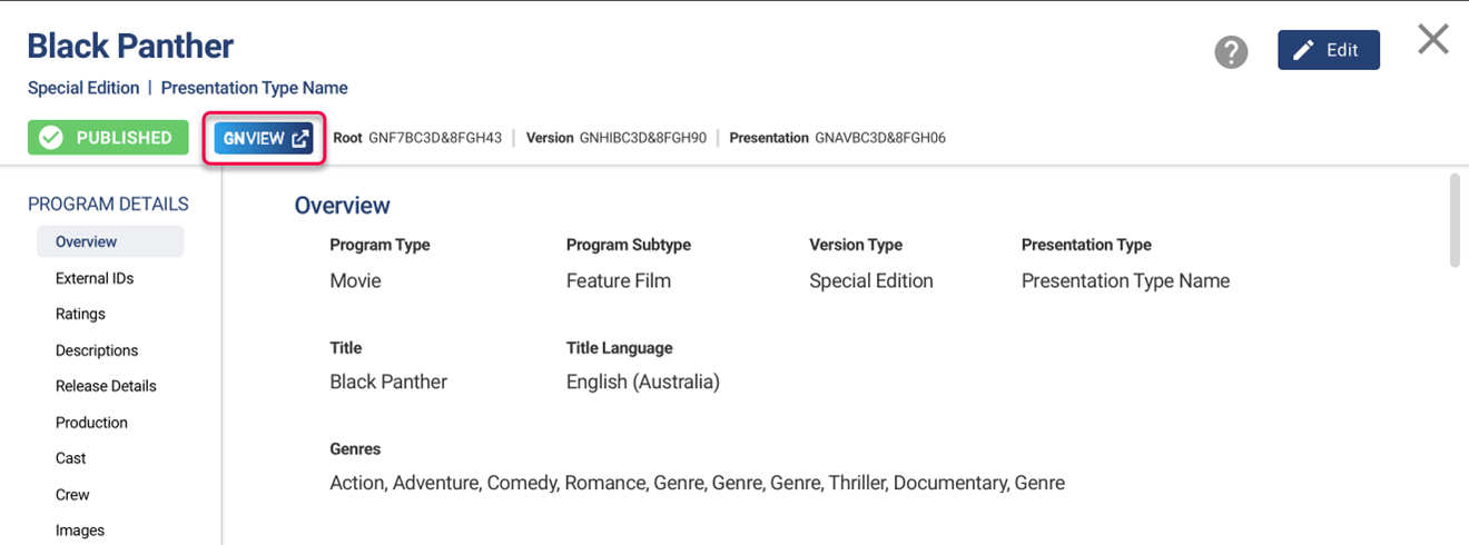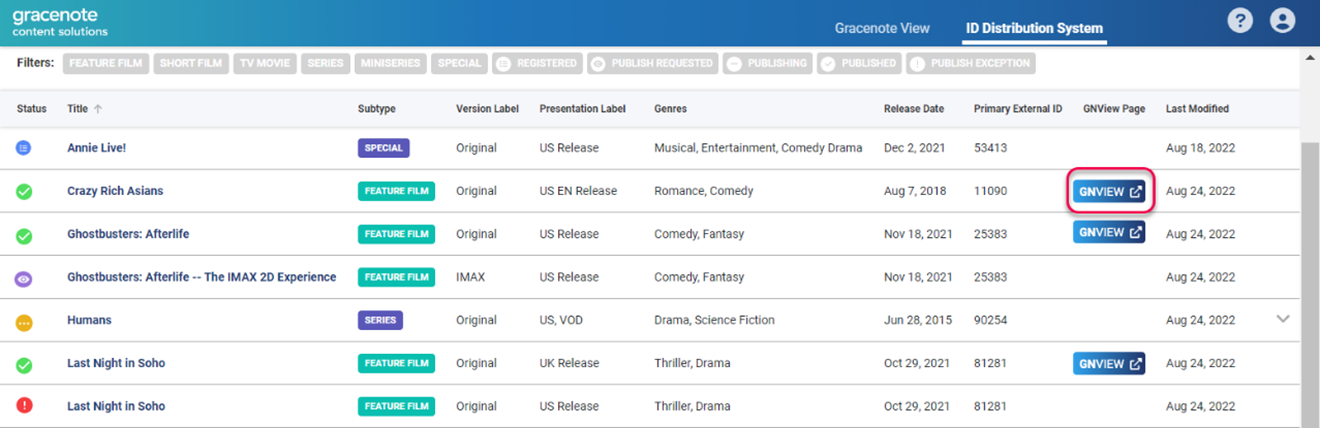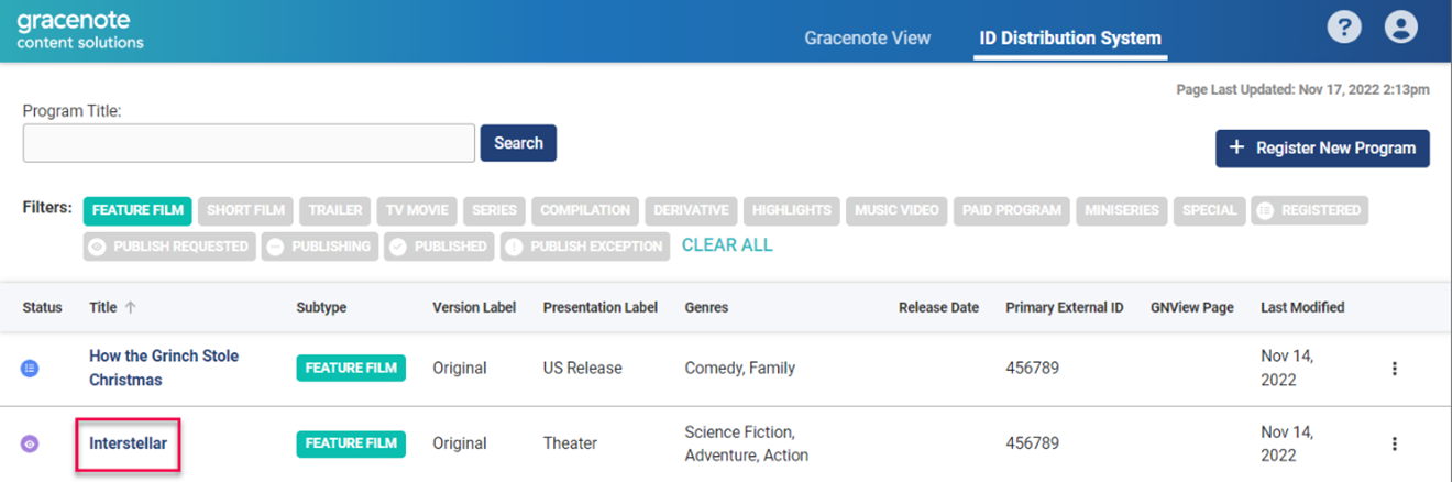 There are two ways to view Gracenote Certified Records for programs you publish with GN IDS. If the published program already exists in Gracenote data sets, you will also see the certified Gracenote editorial content associated with the program.