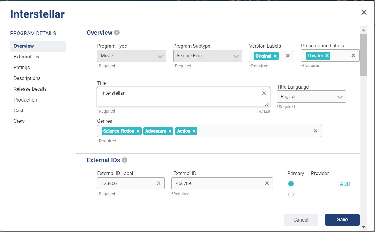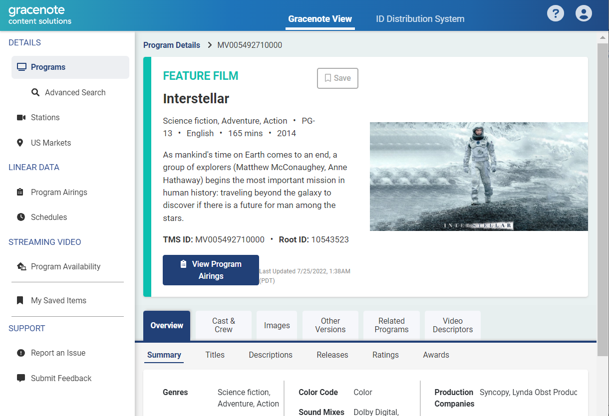 Below is the certified data for Interstellar in Gracenote View:
