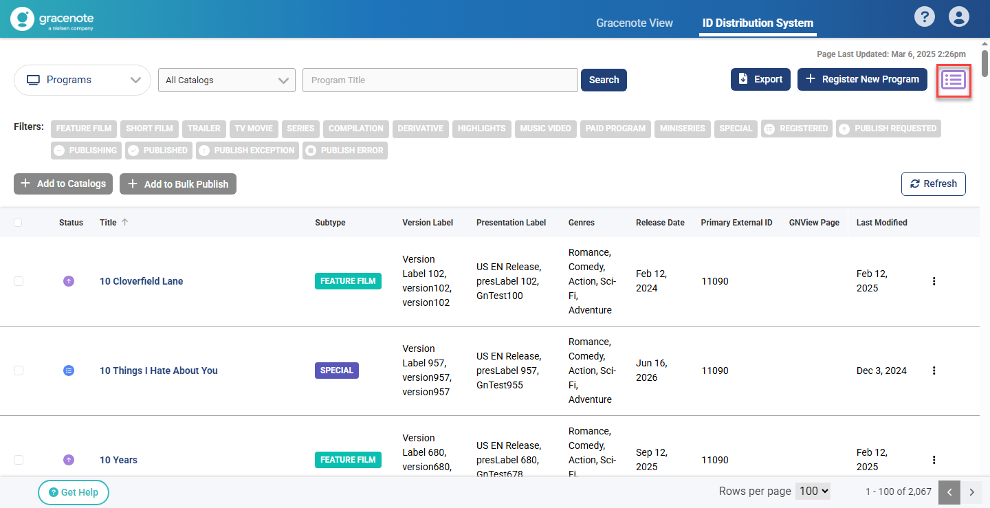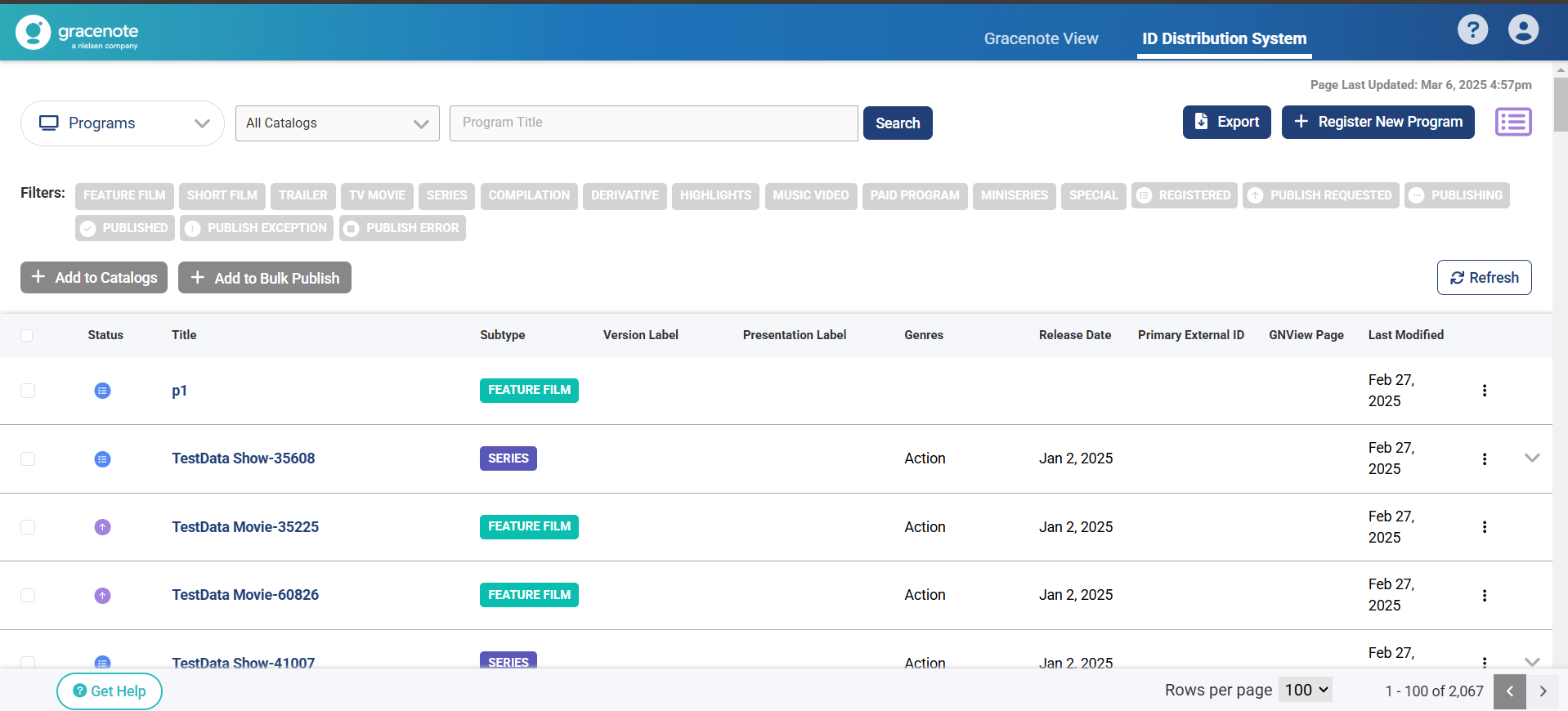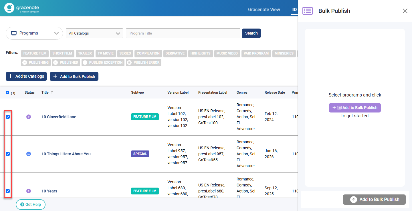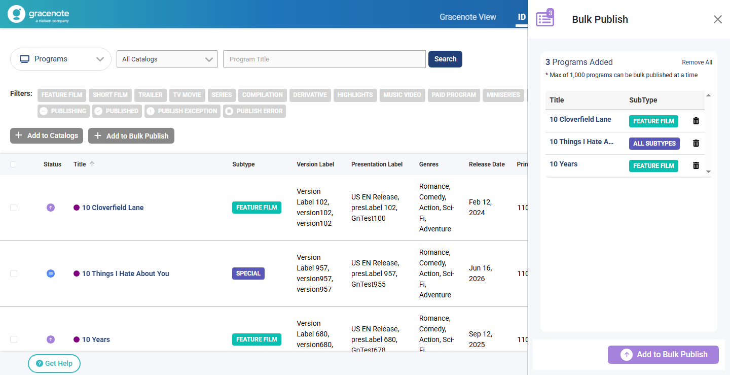 The bulk publish feature allows you to publish multiple programs simultaneously, streamlining the process of making content available in the Gracenote ID Distribution System (GN IDS). This feature is useful when dealing with large volumes of programs. By allowing simultaneous publication of multiple programs, it significantly reduces the time and effort required in content distribution. As part of a comprehensive set of publishing tools, including individual program publishing and republishing options, the bulk publish feature empowers you to manage and update program information swiftly and effectively.