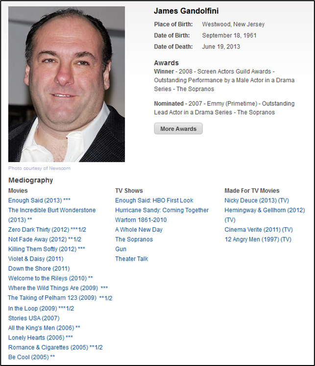 | profile\deathPlace | The celebrity's place of death. | New York, New York USA |