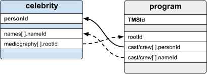 The following ERD illustrates the ID relationships from a celebrity record to other relevant endpoint objects within On API.