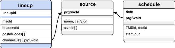 | Schedules Endpoint | TV schedules, organized by station identifier (programming service ID, or prgSvcId) and UTC datetime. |