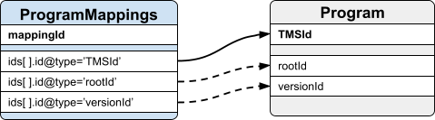 The ProgramMappings endpoint works in conjunction with the Programs endpoint. The ProgramMappings endpoint contains the links between TMSIds and customer asset identifiers, the Programs endpoint includes the actual metadata for all referenced TMSIds, including Series records for any referenced Episode.