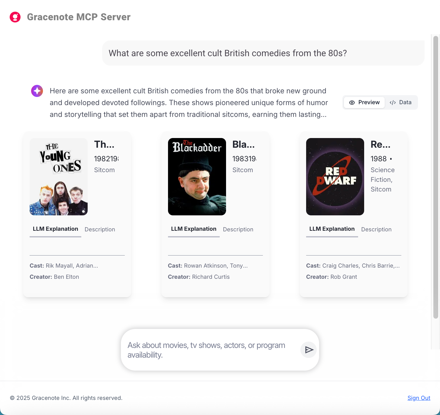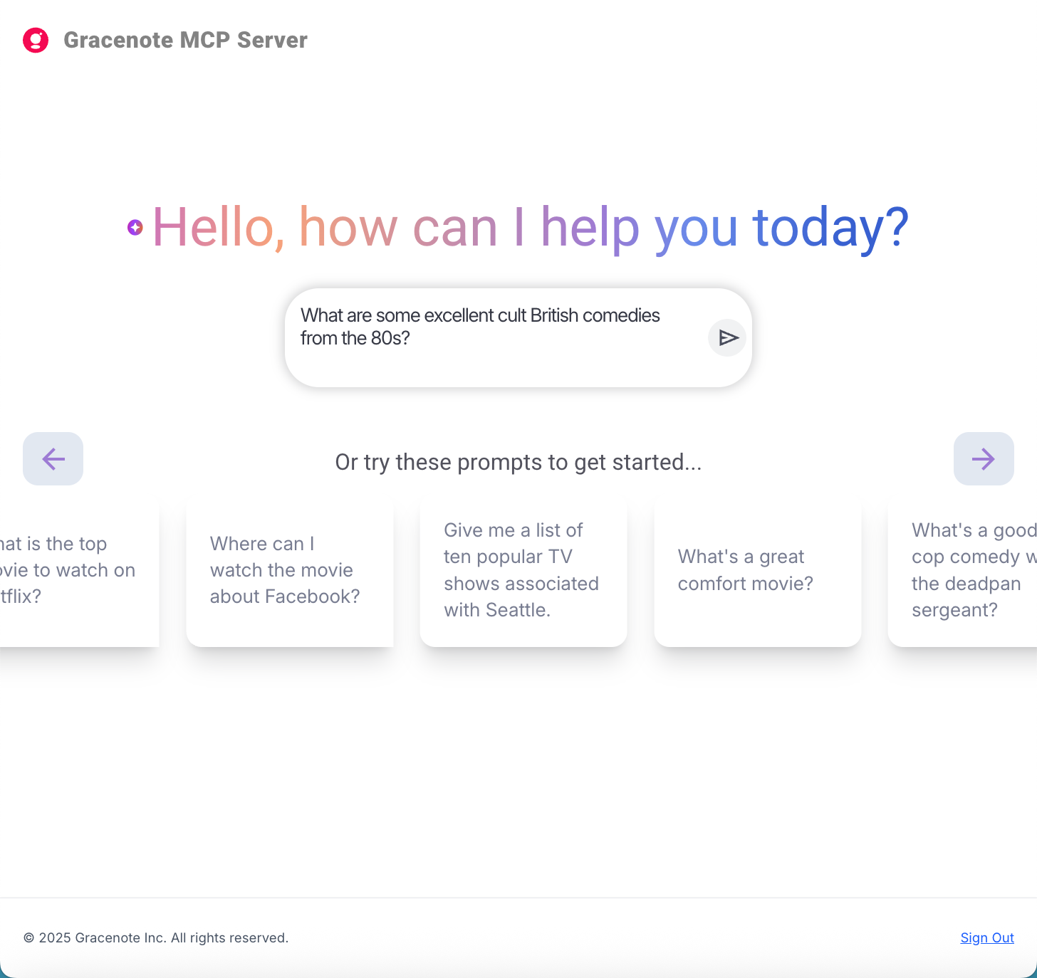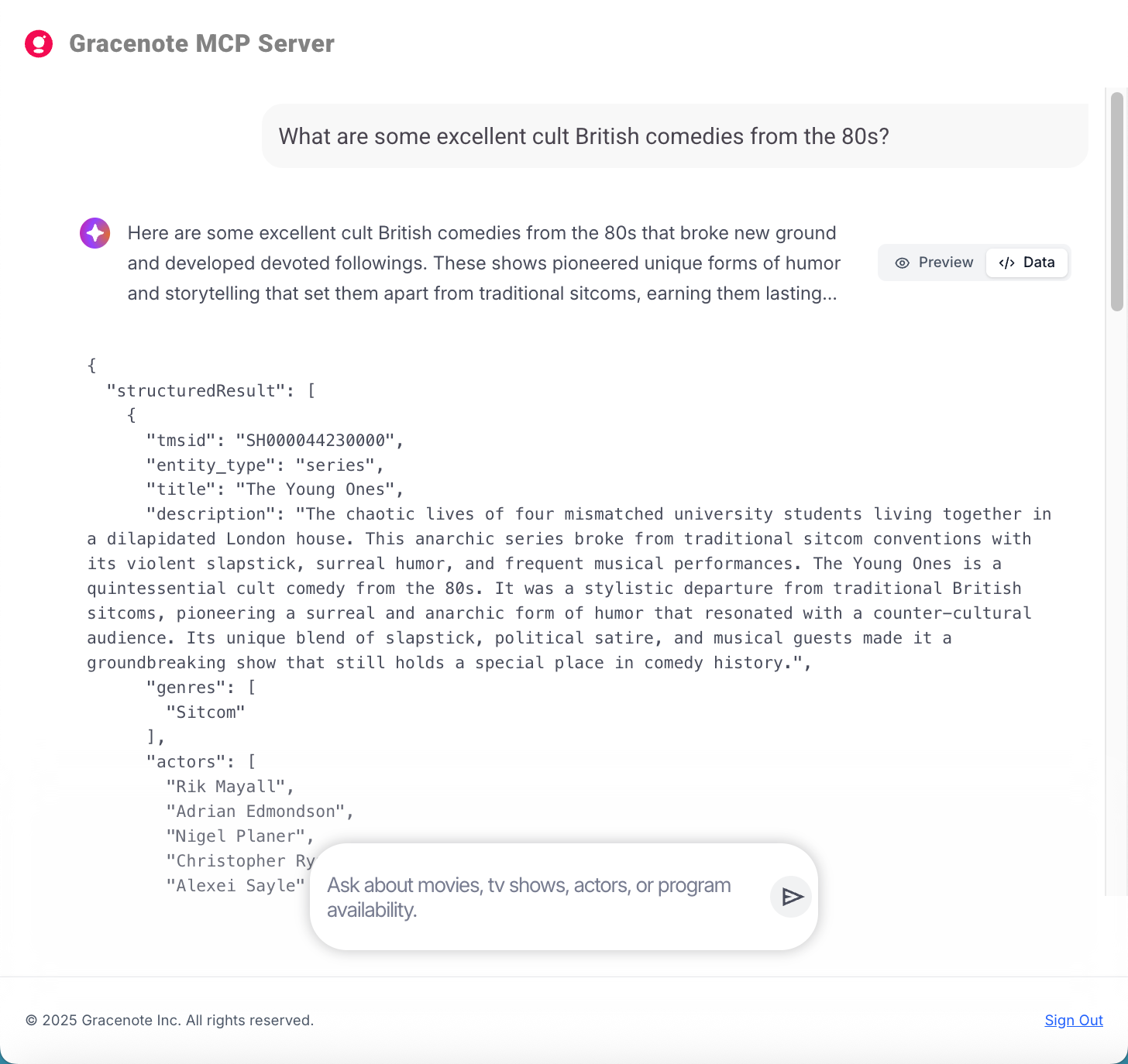Gracenote provides a chatbot to demonstrate the MCP Server. Use this demo to explore use cases and view example responses in structured JSON.